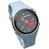 The Bowflex Ana Digit combines the exquisite look of an everyday timepiece with the unique feature of Strapless heart rate display at the touch and hold of a button. This is unit is the smaller version with a light blue band and black face. Perfect for small wrist and women's style. Displays heart rate in a bright red LED display along with analog time of day.